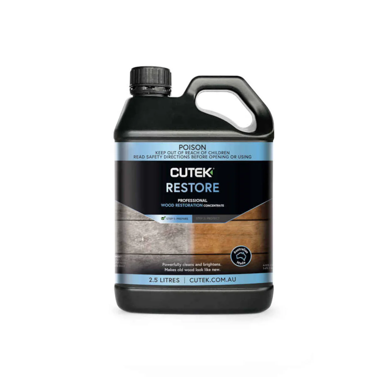 CUTEK Restore (formerly CUTEK Proclean) is a heavy duty, concentrated timber cleaner and stain remover that strips away grey weathering, tannin bleed, iron stains, mould and mill glaze to reveal fresh wood ready for re‑oiling. Simply apple the dilute solution with an applicator, scrub or pressure wash off, then allow the timber to dry before coating with CUTEK Extreme CD50 or CUTEK Wood Preservative.